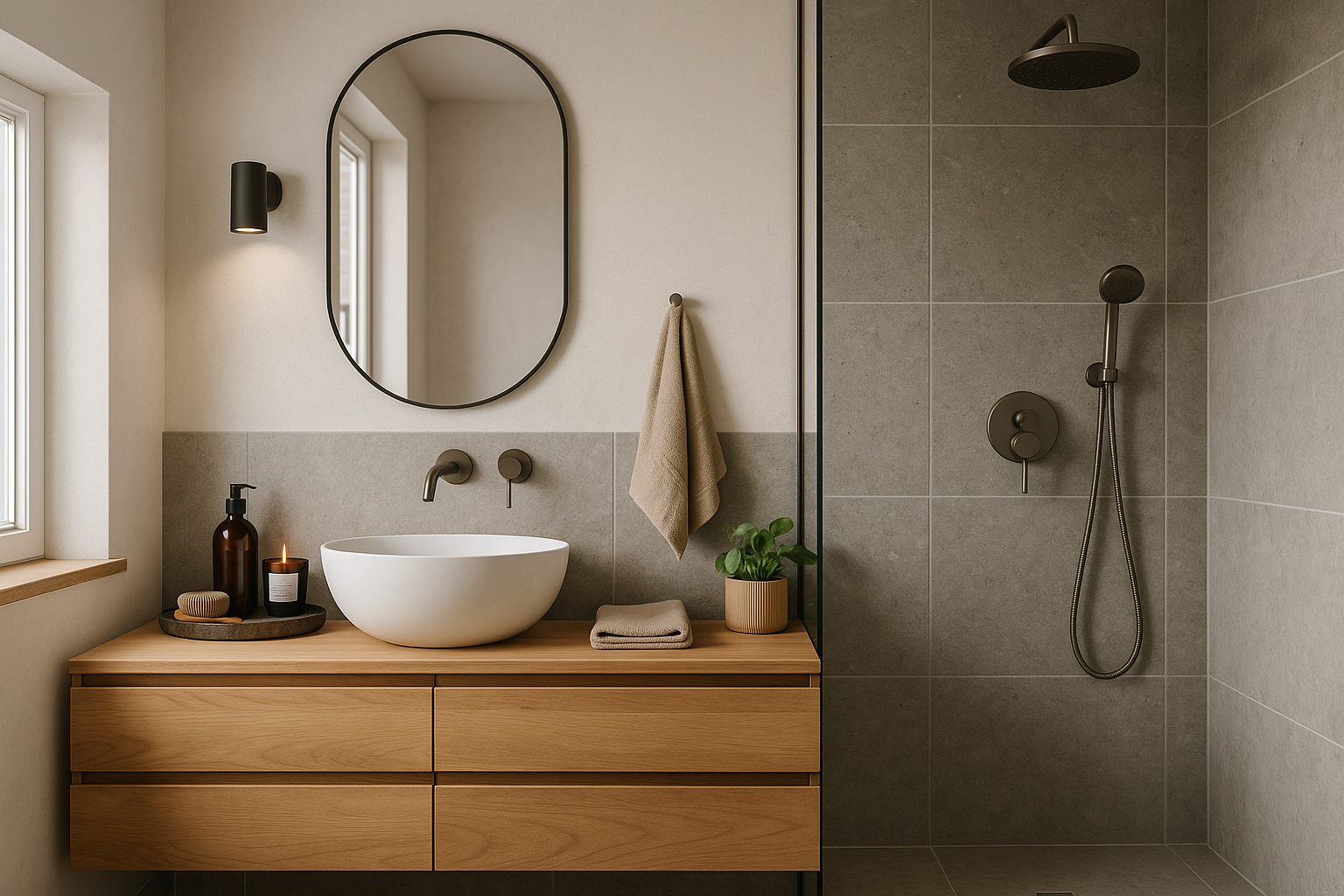 Et ældre badeværelse uden eksisterende ventilationskanal får en decentral enhed med varmegenvinding, der forcerer til 15 l/s via lyskontakt. Håndvasken får berøringsfri armatur med hygiejneskyl hver 48. time. Radiatoren har FJVR og udskiftes til fremløbsventil med smart termostat koblet til Zigbee-hub. Spejlet leveres med IP44, indbygget lys og antidug. Lækagesensorer placeres ved vandmåler, under vask og ved indbygningscisterne. Beholderen stilles til 55 °C, og temperaturen ved tap kontrolleres. Efter aflevering står app-notifikationer og scene for “bad” klar, så ventilation og spejlvarme kører automatisk i 30 minutter.