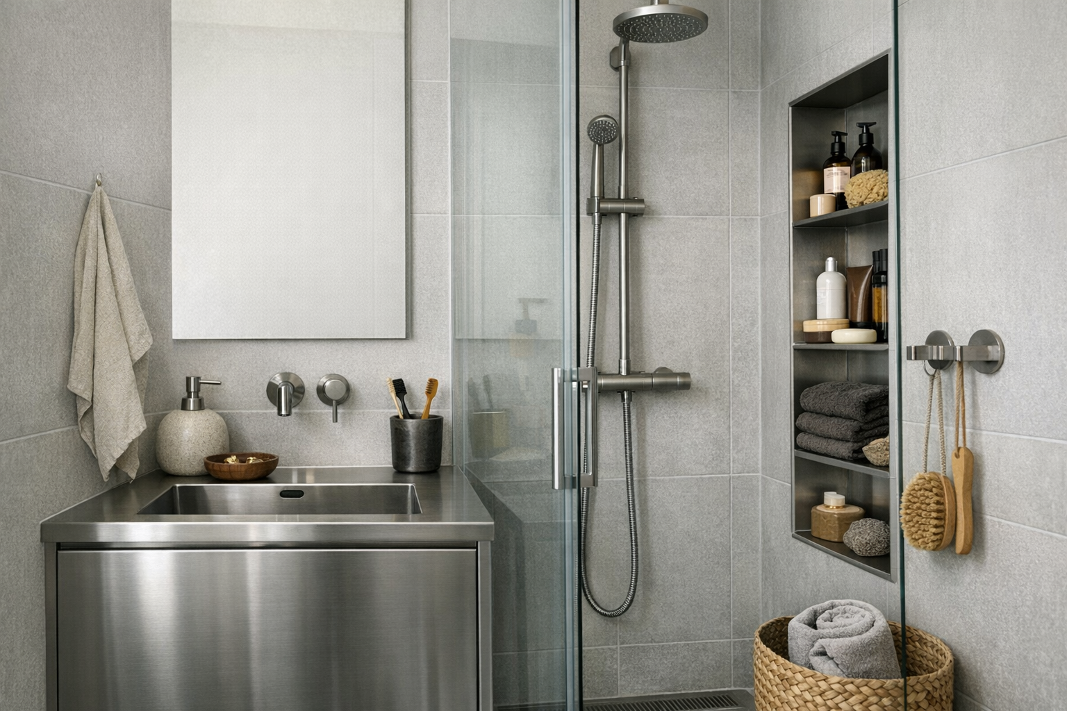 Et lille badeværelse med en gennemsigtig brusevæg, vandafledning og vægpaneler; fokus på pladsbesparelse, nem rengøring og tydelig opbevaring langs brusenichen.