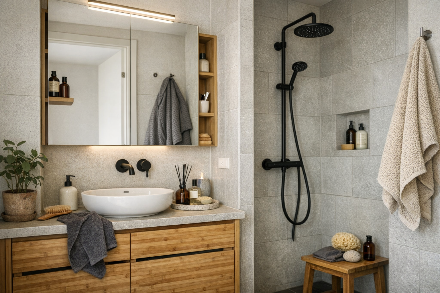 Stram prioritering af, hvad der overhovedet skal bo på badeværelset, er første skridt. Resten handler om at organisere det, der er tilbage, på en måde der både er praktisk og pæn.