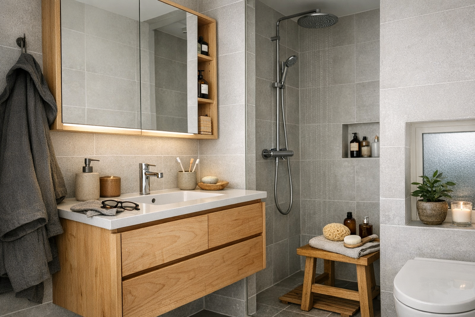 Ryddelighed betyder ekstra meget på få kvadratmeter. Spejlskabe er næsten altid en god idé, fordi de samler spejl og skjult opbevaring samme sted og udnytter væggen optimalt. Indbyggede nicher i brusenichen giver faste pladser til shampoo uden løse hylder, der samler kalk og snavs.